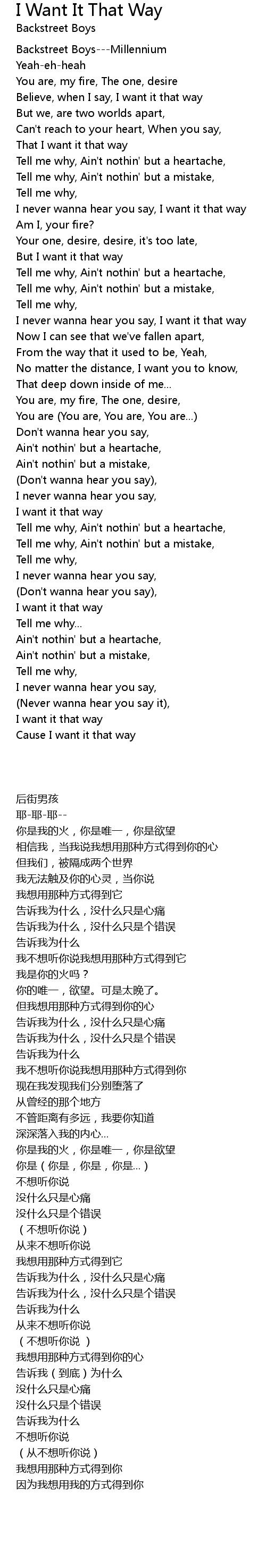 Backstreet Boys - I Want It That Way (Official HD Video), Official music video for "I Want It That Way" by the Backstreet Boys Listen to the Backstreet Boys: . We Have got 6 pics about I Want It That Way Lyrics Backstreet Boy images, photos, pictures, backgrounds, and more. In such page, we additionally have number of images out there. Such as png, jpg, animated gifs, pic art, symbol, blackandwhite, images, etc. "Backstreet Boys - I Want It That Way (Lyrics + Espa\u00f1ol) Video Official", Ayúdanos con una donación, si deseas: paypal.me/brunodolar Canal de Respaldo: @BrunoTraductor Official 2 Cuenta de . "Backstreet Boys - I Want it That Way (Subtitulada Esp - Lyrics)", ..